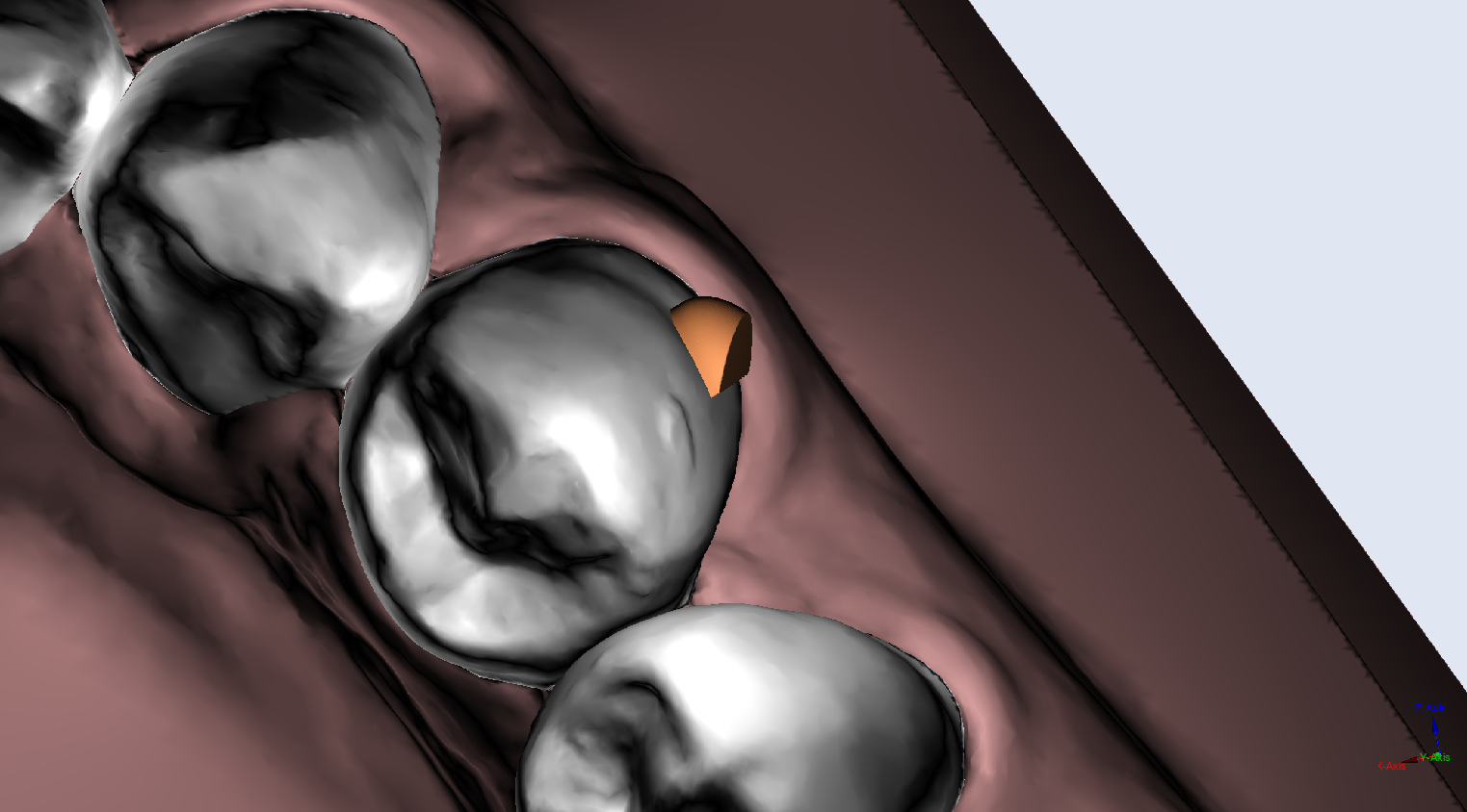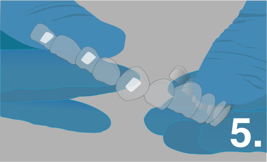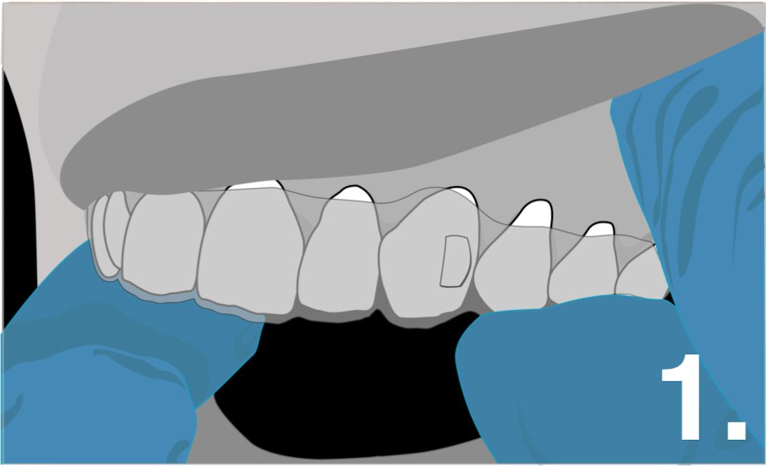 Attachment templates are thermoformed from a special plastic that composite resins will not adhere to. The composite is placed into the template then fitted over the cleaned and prepared tooth. When the composite is cured the tray easily peels away leaving the attachment on the tooth.
